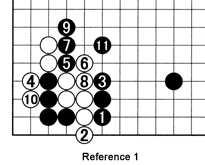 Reference 1: When White kills Black with 4, Black cuts with 5, the premise being White cannot capture this stone in a ladder with 6 even if White plays at 9 after black 7. If this is possible, Black should not play at 3. With an unfavorable ladder, White must connect at 8 and Black sacrifices his corner to builds great center thickness with 9 and 11.
