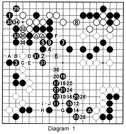 When Black plays at 1, Hane has about 50 points in territory. White has only around 30 points in solid territory. However, the center is still up for grabs. How Yamashita uses kikashi to make territory in the center is instructive. Using the aji (potential) of his marked dead stones, white 2 threatens to attach at A, which would probably be followed by the sequence black 3, white B, black C and white D or E. Black must defend with 3 but White plays kikashi moves at 4, 6 and 8, threatening to cut at F. Again Black must defend with 5, 7 and 9. These exchanges give White center influence and points while Black gets nothing. White then starts to seal off the lower part of his center with 10 and 12. Black 11 defends against G as well as the sequence white H, black I and white J. White cuts off the black marked stone with 14. Backed up by his center stones at 2, 4 and 6, White cuts off black 19 with 18 and 20. Black 25 for 26 is a great kikashi (see Diagram. 2). Black 29 is an attempt to play kikashi but White counters with 30 (see Diagram 3). When White plays 38 he is leading slightly. Yamashita eventually won by 2.5 points.