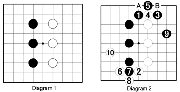 Diagram 2: Last week, after black 1, White answered passively at 4 and went on to lose by a large margin. Following the motto "do unto your neighbor what he does unto you," when Black threatens to invade, White maybe should mirror Black by playing at 2. Naturally, Black would jump to 3. Note that White could cut this stone off. After exchanging 4 for 5, White cannot play at A or B (as this stone would be captured right away), so White jumps to 6 instead. Up to 10, mutual destruction is the name of the game. Now, it is no longer about expanding and defending the borders. Instead, a full-fledged fight is developing. Whatever happens, this situation is preferable to passively blocking black 1 with white 4 at the outset and losing peacefully.
