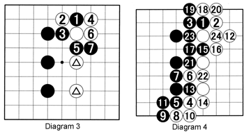 Solution 2: The question was whether you could come up with a response for White to black 1 in Diagram 2, as an alternative to blocking at 4. One solution is given in Diagram 2. When teaching go, instead of giving your students the answers, pose such questions as "Can you think of an alternative that accomplishes the same goal?" and "What happens if...?"