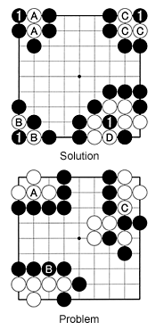 Solution: In the situations A through C, black 1 captures two or three stones. In the final situation, white D captures a stone that was where black 1 is now. But black 1 captures 3 stones.