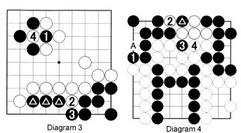 Diagram 3: Now imagine this situation. After black 1, White threatens to cut off the three marked black stones with 2. Black can connect with 3, but that means the board position has changed. In other words, White can now capture black 1 with 4. We refer to white 2 as a ko threat. Often ko threats are answered but not always.