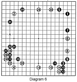 Diagram 6: This game was played about 20 years ago between two top pros. Let us focus on the extensions in this game. Backed up by the strength of 1 and 5, black 7 is a good three-space extension. On the other hand, 6 and 8 form a two-space extension to avoid an invasion. However, black 9 puts pressure on these stones. With 12 and 14 as the fuzzy factor, white 10 and 16 form a two-space extension again. If Black answered 10 by playing at 14, White would have immediately extended to 16. After a slight skirmish in the lower left, White extends all the way to 28, affording Black the opportunity to invade at 29, which is also an approach to the upper left corner. This forces White to make a two-space extension to 30. With 31, the middle game starts. This is a long extension, but Black is not afraid of a white invasion around A because white 2 is weak and Black is strong around 23.