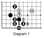 Diagram 1: This sequence provides a classic example of a light shape. Through 10, White plays great forcing moves. But white 11 is the move that separates the wheat from the chaff. Defending tightly with a move at A would be far too heavy.