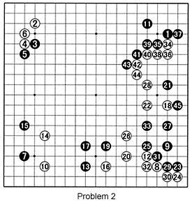 Problem 2: In a game between two top pros, the situation became hairy when Black attached with 45. What is White's best response? This is a difficult problem even for top amateurs, but do your best. Try some variations, using a board if necessary.