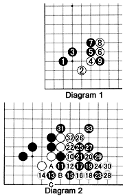 Diagram 1: Although white 4 is not in vogue anymore, we can still learn a lot from the sequence that starts when Black cuts at 9.