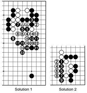 Solution 1: When Black cuts at 1, White exchanges 2 for 3, then sacrifices his two marked stones with 4 and 6. But after 8, Black keeps up the attack with 9, 11, 13 and 15. Next, Black sacrifices 11 and 13, while building a huge framework in the center. This game is instructive in the way both players sacrifice a few stones that have served their purpose to a greater end.