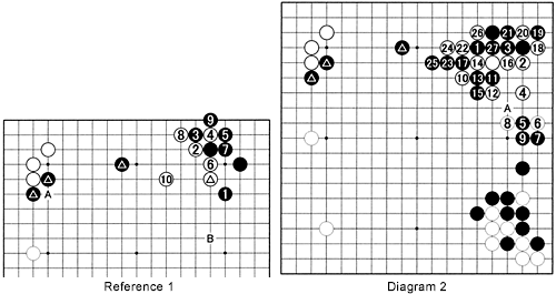 Diagram 2: To prevent his marked stones from being attacked, Black chooses 1, followed by white 2. After black 3, White should not connect at 16 as black A next would make these stones very heavy. White proceeds lightly through 10, but Black launches a strong attack with 11. White then forces the sequence through 27. How will he proceed?