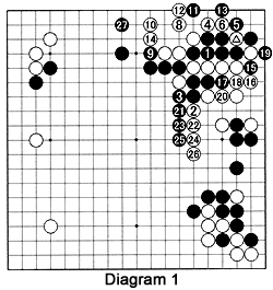 Diagram 1 (Black 7 connects where the marked stone was captured): Challenger Shinji Takao is trying to take the Meijin title from Cho U and is leading 3 games to 2. Let us look at how he pulls off a half-point victory playing White. After black 1, White must make the 2 for 3 exchange before the sequence 4 through 10. Although these moves lose points at the top, it does allow White to play at 14. Black 11 and 13 have a meaning as they enable black 17 (see Reference 1). Black then builds influence with 21 through 25 before switching to 27, which White seemingly has to answer.
