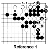 Reference 1: Without the A through D exchange in the game, after black 1--a move that greatly reduces White's eye-shape--White can capture with 2. Black 5 and 7 form a strong combination, but white 8 and 10 capture Black's group, because black A and C are not in place.