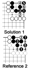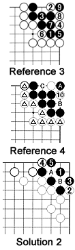 Reference 3: Sometimes, after black 3, White 4 is the correct move. This leads to a long sequence. After 8, Black captures two stones with 9.
