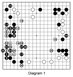 Diagram 1: In the sixth game for the Meijin title, challenger Shinji Takao (White) captured the title from defender Cho U. After black 1 and 3, White's marked stones are in danger. How should he deal with that? The best move is white 4--this is the solution to last week's Problem 1 (see References 1, 2 and 3). In the sequence to 14, White strengthens his marked stones while Black is forced to play at 15 to defend his eye shape. White 18 and 20 are typical of Takao's style--slow but thick. Black launches a strong attack with 21 through 25, then applies pressure with 27 and 29. However, White answers with 30, again one of those "right" moves (see Reference 4).