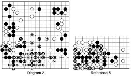 Diagram 2 (35 and 40 capture the ko around the marked stone): Black ignores white 30 and attacks with 31. White then starts a ko with 32. By ignoring the threat at 41, White wins the ko with 42, but black 43 and the following moves are strong. However, white 52 is a clever move. White cannot cut at A (see Reference 5). In the sequence that follows, White splits Black's groups and even manages to squeeze in 64 through 70 to make a connection underneath. If black plays at B, white would play at C. Suddenly, Black is eyeless and weak on both sides while White rules the center with 72 and 74. In the end, White wins by 3.5 points to grab the Meijin title and ¥36 million in prize money.