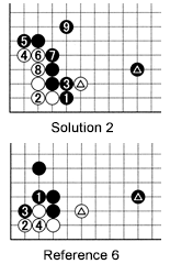 Reference 2: In response to White's attachment, black 2 looks like the right move, but Black cannot cut at 8 after white 7. White 9 through 15 set up a ladder that captures Black's stones.