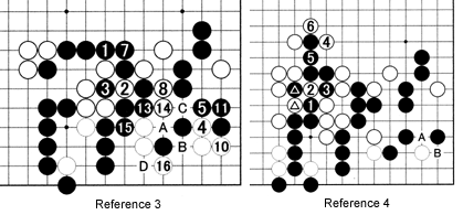 Reference 4: After 25 in Diagram 2, when White plays the marked stone, Black cannot cut with 1 and 3, because he gets creamed when White plays 4. After this move, Black needs to fight the ko at 2, but, as mentioned before, White has many ko threats around at A and B. On the other hand, Black cannot hope to escape to the center either and connecting at 5 will only provoke white 6.