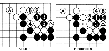 Reference 5: Black 1 does not take sufficient advantage of the White mistake at A. White 2 is the vital point. Black captures the marked stone with 3 and 5, but after white 6, he has to connect at the spot where the marked stone was taken.
