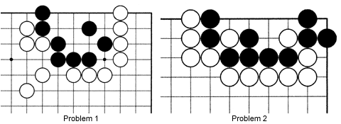 Problem 2: Using the same diagram, White can kill the Black group if he plays first. How? The solution gives a hint for Problem 1.