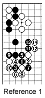 Reference 1: After black 1, if White blocks with 2, the sequence through 10 is almost forced, allowing Black to comfortably live up to 13. After 14, White can switch elsewhere.
