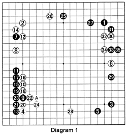 Diagram 1 (1-35): With 11, Black initiates hostilities. This move is a new kind of play and gives rise to the sequence through 24, leading to a very unusual pattern. As a result, we cannot make historical comparisons. How shall we evaluate this situation? See the analysis in Diagrams 2-4.