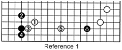 Reference 2: The marked stone aims at invading with 1. White's sharpest moves are 2 and 4. However, the presence of the marked stone enables Black to cut with 5. In other words, White will have to compromise somewhere along the line.