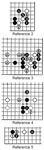 Reference 5: This is a common joseki (standard exchange) we discussed a few weeks ago. Usually, Black's marked stone and other stones around it are not in place. How does this change Black's response?