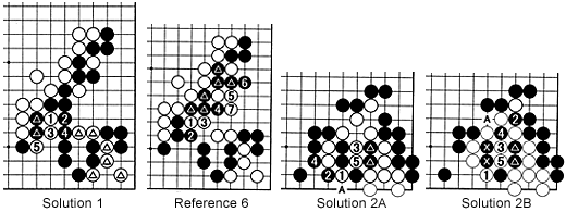 Solution 2B: Black can also play 2 or A, but no matter what, white 3 finishes off Black one way or another and either group of marked stones is taken with 3 and 5.
