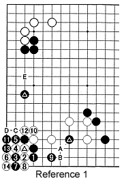 Reference 1 (black 15 at 3): In response to the marked white stone, black 1 is the usual move. The moves through 15 (played where his stone at 3 was captured earlier) form a joseki (standard exchange). However, this is not so good because White can play at A or B to cut off the marked black stone. White can also play C and D in sente (Black must answer these moves) and aim at a strong invasion at E to cut off Black's marked stone there.