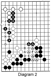 Diagram 2: Let's evaluate this position for a second. Black is threatening to play A, which would be followed by white B, black C, white D, black E and white F to start a ko, putting all of White's marked stones in jeopardy. He must be sure his two marked stones in the center can escape--that is already a problem in itself. At the same time, Black's marked stones on the left are also in danger as White can play at G, followed by black H, white I, black J, white K, black L, white M, black N and white O, leaving Black dead locally. He can escape, but the problem is can he do so with all of his marked stones?