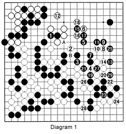 Diagram 1 (1-29 represent moves 123-151): Let us resume the game we started two weeks ago between titleholder Keigo Yamashita and challenger Satoru Kobayashi (Black) in the 31st Kisei title match.