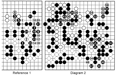 Reference 1: Black 1 is an exquisite move. White 2 is the best response as it defends against the threat at A and stops Black playing at 15 in sente as well. If White plays at A instead, Black will force 15 for 2 in sente, which is even better than the sequence shown. On the other hand, if White plays at 15 (as in the actual game), Black can play the ko, using 3 and 5 as good ko threats-White would not stand a chance in that case. After forcing 1 for 2, Black reinforces his position against a possible counterattack by White at B, followed by black C, white D, black E and white 5. Now Black is ready to strike with 7. The moves through 21 show one example of how White's position crumbles. White cannot connect at F, because of black A.