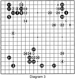 Diagram 3: This game is between Cho Chikun, holder of the Judan title, and current NHK Cup titleholder Hane Naoki for the NHK Cup. The games are broadcast every Sunday on NHK. In his inimitable style, Cho, who plays Black, usually grabs territory early in the game in exchange for giving his opponent thickness and moyo (territorial framework). Then he jumps right in there and the game is often decided by his invading group living or dying. This game is a perfect example of this strategy. The sequences in the top left and top right are both joseki (standard corner patterns). As expected, Cho chooses these joseki patterns because the corners become solid territory. The point where White can deviate is after black 29. Providing a running commentary, Takao Shinji mentioned he had played a similar game with Cho up to move 29. At that stage, he opted for A, but was crestfallen when this was answered by black B. In retrospect, he said playing at 30 immediately is probably better, which is what happened in this game. After white 36, the question is how and where Black should invade. For starters, he starts through a nozoki (peeking between two enemy stones) at 37. Would you connect at D now? If not, how would you cope with this situation?