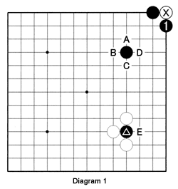 Diagram 1: After explaining that Black plays the first move on one of the intersections, I talk about liberties. A stone cannot exist and must be taken off the board if it has no liberties. The sole black stone in the diagram has four liberties, at A, B, C and D. The marked black stone has only one liberty, at E. The marked white stone has no liberties when Black plays at 1 and must be removed from the board.
