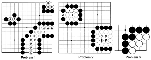 Problem 3: This is a so-called nakade shape. If Black plays first, the white stones die. Where should Black play? If it is White's turn, where should he play?