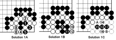 Solution 1A: In response to 1, White must connect at 2. White 4 and 6 are harder to work out. After white 8, the fight seems over, but hold on...