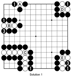 Solution 1 (Note that in all five situations, White's moves are unimportant and have been omitted): White A has one liberty, so it takes only one black move to capture it. Play the move and remove the stone. The stones at white B have two liberties, so Black needs two moves, 1 and 3, to capture the three white stones. The white group of eight stones at C has one liberty. Black 1 occupies that last liberty to capture the White stones. When beginners see situation D, many are confused at first. It seems Black cannot move at 1 because this would leave him without liberties. However, White's stones have only one liberty, and black 1 takes away that last liberty. The white stones around E have two liberties. Black needs two moves to capture them. Technically, White could capture black 1 by playing at 3, but that would be pointless as it would leave White with just one liberty (see Reference 1).