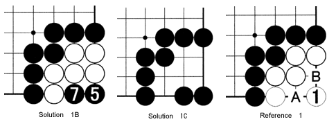Solution 1B: Again, White has two liberties. Black 5 occupies one of them. Theoretically, White can capture this lone stone by playing at 7, before Black plays there. After that, White has one liberty left where he captured black 5. Black can capture all of White's stones by playing at 5 to take away White's last liberty. In other words, resistance is futile. If White does not do anything and plays elsewhere, Black can take away White's last liberty with 7.