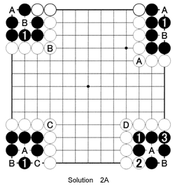 Solution 2A: In problems A, B and C, Black should play at 1 to separate his living space into two parts, A and B. These separate spaces are called eyes, and a group with two eyes stays alive. Note, White cannot play at A or B because that would be suicide. In problem C, Black must not play at C, because White will strike at 1 and kill the group. In problem D, Black needs two moves, 1 and 3, to stay alive.