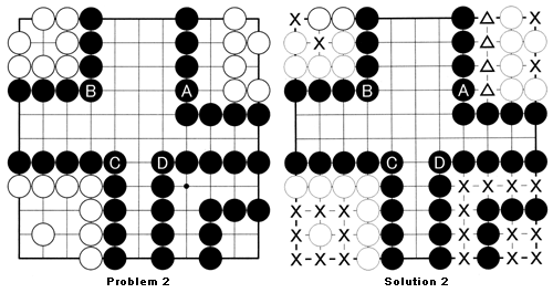 Solution 2: In the cases A through C, Black surrounds White stones. However, in each case White has two eyes and is alive - see Solution 3 in last week's column, for more information on life and death. That means that the spots marked with an X all comprise White territory. White's territory around A is two points, around B, it is two points, and around C, White's territory is eight points. In case D, Black's stones surround 7+4=11 points. What about the points marked with triangles around A? These points are neither surrounded by Black nor White, so they are neutral points, also called dame. Naturally, dame points are worth zero for both parties.
