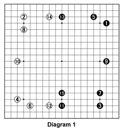 Diagram 1: Let us look at a full-size 19x19 board. Now assume White imitates Black's moves until 10. In response to 11, he plays 12, and he answers 13 with 14. After 15, it is clear Black's territory is larger than White's. Even if White seems to be playing natural moves, he is falling behind. Of course, Black has an advantage because he plays the first move, but this is too much.