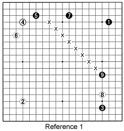 Reference 1: After 5, if White answers at 6, Black will probably play at 7, a popular strategy these days. If White plays at 8 next, black 9 is just perfect. Black aims at establishing hegemony above and to the right of the marked line in the center.