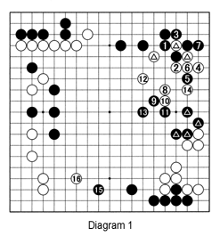 We also introduced QARTS, a system that expresses quantitatively how much a weak group is worth. A weak group without eyes is worth about minus 20 points, while a weak group with an eye would be worth about minus 10 points. So reinforcing a weak group by making a base or rendering your opponent's group eyeless, is worth about 20 points. That is the reason why moves close to a weak group are so valuable--they have the potential to fulfill both of these functions and can be worth as much as 40 points. At this stage, both Black's and White's marked stones are weak. Black 1 and 3 safeguard the corner while keeping White weak. While black 7 defends, its main purpose is to take away White's eyes. Without a base on the right, White must move into the center with 8. Since neither player can make two eyes on the right, the escape route to the center becomes all-important. Black 9 is an important point. White 10, 12 and 14 make eyes and a few points, but black 9, 11, and 13 make some territory while building up center strength. Black 15 is a strong move (see Solution 2), while white 16 has a special purpose (see Reference 1).