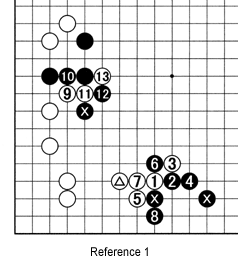 Reference 1: White's marked stone aims at cutting with 9, 11 and 13. However, before doing so, a preparatory combination at the lower edge, such as 1 through 7, makes the split between Black's marked stones even more effective.