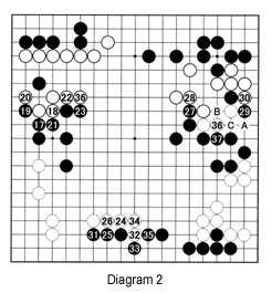 Diagram 2: As shown in Reference 1, Black should reinforce on the left, which he does with the moves through 23.