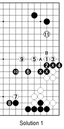 Solution 2a: White should play at 1. This move has multiple purposes. First, it is an extension from the lower left. Second, it threatens to cut through with the sequence white A, black B, white C, black D and white E. If Black defends with the sequence 2 through 8 as in the game, White strikes with 9 through 13, the third raison d'etre for white 1. After this combination, White has built up a tremendous framework around the marked area, while Black's group in the lower right is still without two eyes.