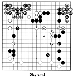 Diagram 2 (41-72): No, even though his marked stones help to isolate the white marked stones, Black decides not to attack those stones with a move such as A. Instead, he invades with 41 in White's largest territory. In order not to hurt his center group, White plays carefully and Black is able to make a comfortable situation for himself at upper left while destroying most of White's territory with the sequence through 59. White now defends his center group in sente by exchanging 60 for 61. Next, it is his turn to invade with 62. Instead of 68, White could have lived with the sequence shown in Reference 1. However, that might have given Black the chance to attack the center group. On the other hand, Black cannot give in to White's demands and has to play at 69, which leads to a ko when White plays at 70. Black captures the ko with 71 and White plays his ko threat with 72. What would you do if you were Black?