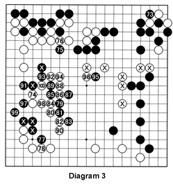 Diagram 3 (73-100): White has an almost infinite source of ko threats on the left and if Black replies to one, he must reply to all of them, which means he would lose the ko. Therefore Black resolves the ko with 73. This is large in terms of territory and weakens White's center group further. After White follows through on his ko threats with 74, the game is about the fate of White's and Black's marked stones. Black is willing to sacrifice his marked stones to start a strong, possibly fatal, attack on White's center stones. White resists with 86, which leads to the highlight of this game. Black 97 is a fantastic tesuji (skillful move) that saves Black's group on the left (see Reference 2).