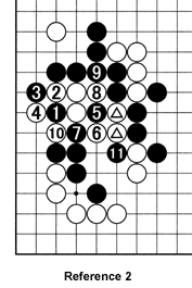 Reference 2: After black 1, if White plays at 2 and 4, Black 5 is a clever move, White has no choice about 6 through 10 but black 11 puts him on the spot. One way or another, White loses three stones, including the marked ones. That means Black would connect all his surrounding stones, ending in disaster for White. White therefore chooses the variation in the game and lets Black live.