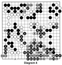 Diagram 4 (1-68 represent 101-168): Black 1 makes his group alive. Since Black's territory is almost fixed, the game now is about on how large a scale White can capture the marked black stones. Black breaks through with 3 through 9 and with 11 through 19. In the end, the combination 57 through 67 ensures victory for Black as the presence of 67 means he can jump all the way to A. The rest of the game is not shown. Black wins by 4.5 points.