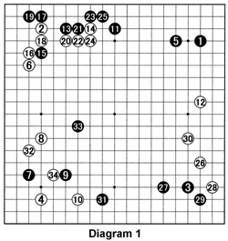 Diagram 1 (1-34): Before having a look at the game, please try to appreciate the psychology of a match over 10 games, each played over three days. Go had never been defeated in a juban go, but his opponent Iwamoto had just captured the Honinbo title, the most important title. It is hard to describe Go's style, but one characteristic is that he always keeps the bigger picture in mind while reading out long and complicated sequences. At the same time, Go seemed to be able to complicate things when behind and stay calm under the most trying conditions on the board.