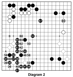 Diagram 2 (35-67, White connects with 44 not shown): Black skillfully sacrifices 35 and escapes with 37 through 47. However, White builds influence, which Black tries to neutralize with 67. Note White can connect with A or escape with B.